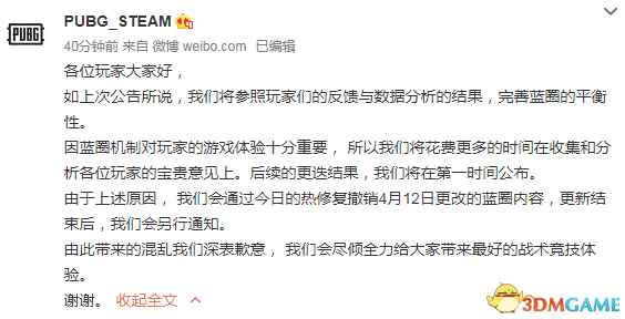 微博原文: 各位玩家大家好, 如上次公告所说,我们将参照玩家们的反馈与数据分析的结果,完善蓝圈的平衡性。 因蓝圈机制对玩家的游戏体验十分重要, 所以我们将花费更多的时间在收集和分析各位玩家的宝贵意见上。后续的更迭结果,我们将在第一时间公布。 由于上述原因, 我们会通过今日的热修复撤销4月12日更改的蓝圈内容,更新结束后,我们会另行通知。 由此带来的混乱我们深表歉意, 我们会尽倾全力给大家带来最好的战术竞技体验。 谢谢。 有玩家在微博下方调侃:叫我宝贝我就勉强继续玩这个游戏。然后官方真的喊宝贝儿了。非常夸张!
