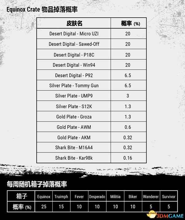 现在玩家可以实时观看正在进行的自定义游戏 - 玩家们直接观看开启‘公开观看(Public Spectating)’设置的游戏 - 为了观看私人模式游戏,需要输入该房间的密码 * 自定义游戏的实时观看功能还处于早期开发阶段,有些功能不是很稳定,对此我们还请谅解。 新箱子 新增了一种付费箱子和一种新的平底锅皮肤 - 为了验证安全性能, 将提供10个“Equinox”箱子,20个“Weapon Skin Key”, 20个“Early Bird Key”, 10万BP给所有测试服用户 (仅限测试服) 每人可有一次机会费 5,000 BP 获得平底锅皮肤"Target Practice" 通过本次新增的付费箱“Equinox Crate”可以获得武器皮肤。这个箱子会在25%的机率从每周随机箱获得。 - “Equinox Crate”可用STEAM商店购买的“Weapon Skin Key”(武器皮肤钥匙)打开 - 现在打开箱子时,幸运的玩家可以除了普通的物品之外,可以获得额外的皮肤物品 新的付费宝箱掉率与每个箱子在每周随机箱子掉落概率如下