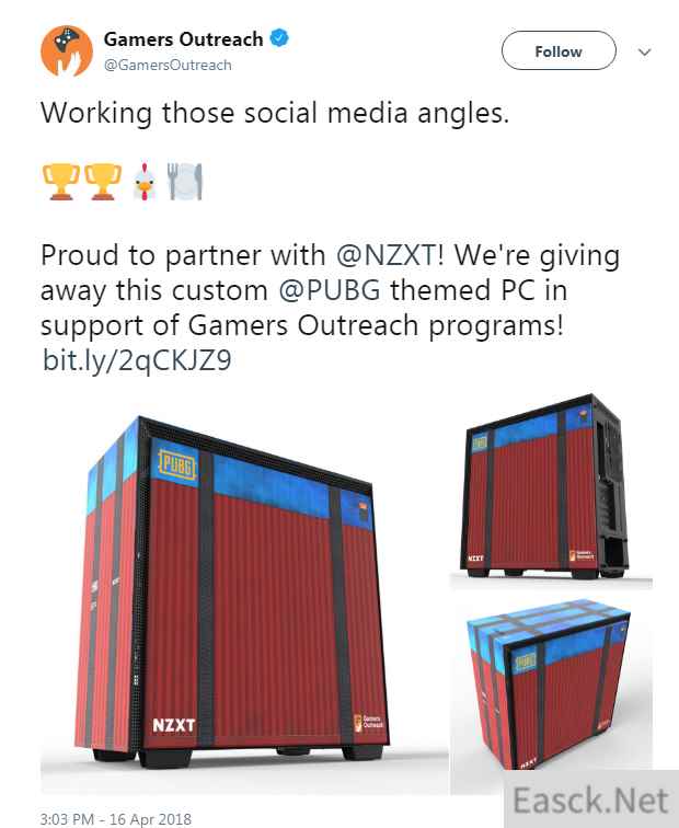 Gamers Outreach是一家游戏业慈善机构,主要为儿童服务,Gamers Outreach称与NZXT合作很骄傲!他们将送出《绝地求生》主题PC主机,快来支持Gamer Outreach的慈善项目!