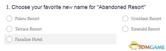 微博原文: 玩家们大家好, 估计大家通过最近的几轮测试已经见到了我们的新地图代码:SAVAGE。现在,我们正在为新地图内的“Abandoned Resort” (遗弃的度假村)地区起名字。这一次,我们将尝试以玩家参与的方式来决定该地区的名字!目前我们已有五个候选名,希望大家能为自己喜欢的名字投上一票! 投票链接: https://www.surveymonkey.com/r/H3VXK59