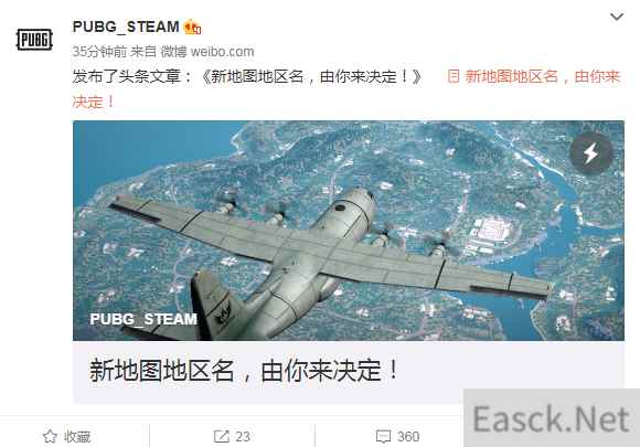 《绝地求生》Steam微博今天公布新地图地区名将由玩家投票决定,这个地区暂译为“遗弃的度假村”,投票会从4月24日下午1点开始,4月26日 上午10点截止,目前官方已经定出5个候选名,分别为Palms Resort,Nosidam Resort,Terrace Resort,Emerald Resort和Paradise Hotel,而在微博评论中,玩家人气最高的名字是“55 open”,已经获得290个赞,玩家还是很皮的,当然这只是玩笑。 微博信息: