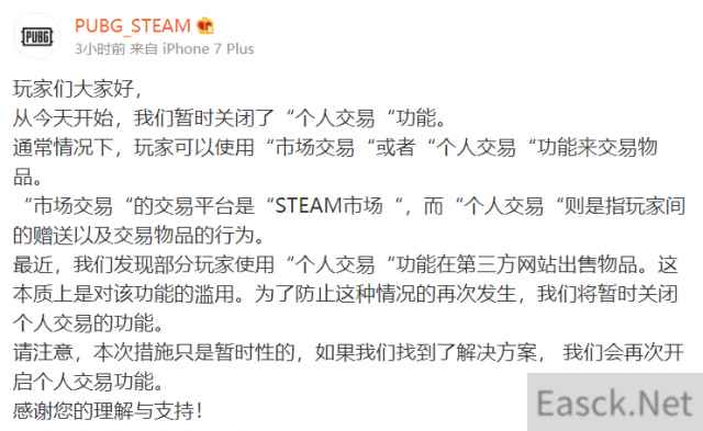 5月3日晚间,《绝地求生》官方微博宣布将暂时关闭“个人交易”功能。