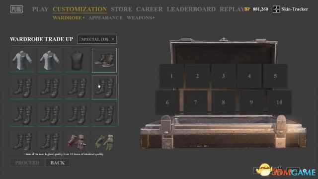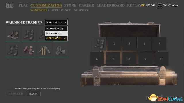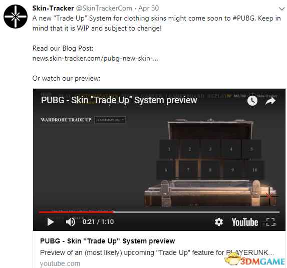 Skin-Tracker日前曝出了《绝地求生》全新服装皮肤“合成”系统,这个系统即将上线《绝地求生》游戏。从视频内容来看,玩家可以将衣柜中的服装皮肤进行合成,10件合成一件,需要花费一定的BP。10个普通皮肤可以合成1个经典皮肤,10个经典皮肤合成一个特殊皮肤,10个特殊皮肤合成一个稀有皮肤,所花费的BP分别为300,500和1000。 推特信息:全新的衣柜皮肤合成系统即将上线《绝地求生》。不过注意,这个目前还处在开发阶段,可能会变更!