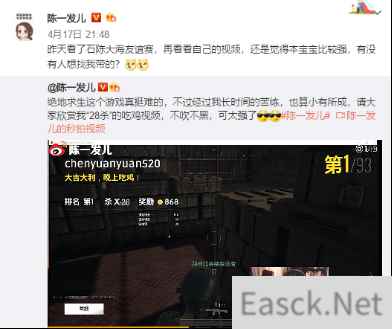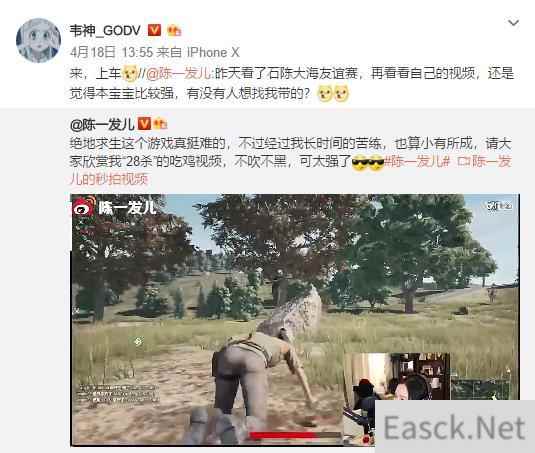 原来,上月陈一发在微博发表视频,炫出了她“非单场比赛28杀”的“强大”实力,并且公开表示:有没有人想找我带吃鸡的?