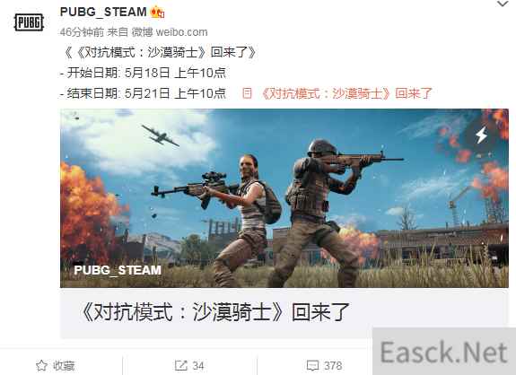 《绝地求生》Steam官博今天公布对抗模式-沙漠骑士回来了,沙漠骑士活动已在今天上午10点开始,活动将在5月21日上午10点结束。玩家将在沙漠地图Miramar进行激烈的对抗,最多5人组队,最多10个团队可以一起参与游戏。被淘汰的玩家可以无限重进游戏。最快得到200积分的团队获取胜利。 官方微博: