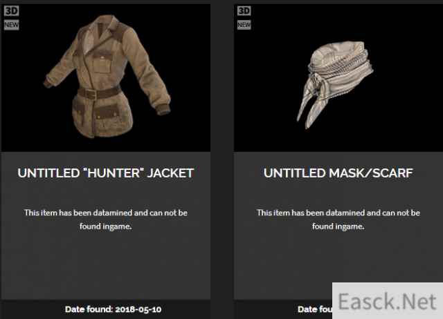未命名的“猎人”夹克,未命名的口罩/围巾 ,目前这2款皮肤没法在游戏中找到,模型资料于2018年5月10日发现。 图片如下:
