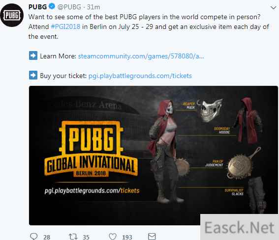 《绝地求生》官方今天公布了柏林全球总决赛限定皮肤名称,购票即可前往柏林观赛,还可以获得全球赛限定皮肤,《绝地求生》PGI 2018全球决赛会在7月25日-29日进行,每天观赛就有机会获得限定独占道具。 从官方公布的图片来看,限定道具一共有4种,分别为死神面罩,末日连帽衫,审判之锅和幸存者长裤,玩家在游戏中带上这些道具一定非常吸睛,尤其是审判之锅。 官方推特:
