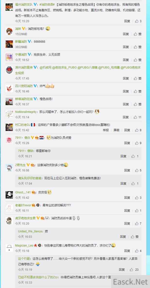 官方描述:“你有你的绝地求生,我有我的橙色战场。新版本不止有轰炸区、燃烧瓶。新增:多功能水枪、直流水枪、防蜂吉利服、机动链锯,还有万一被敌人火攻怎么办”。 目前这段视频在微博上获得了2000多个转发,评论超过600条,2300多个赞。有网友戏称如果国服《绝地求生》换成视频中的消防玩法,那么审核就会快很多了。