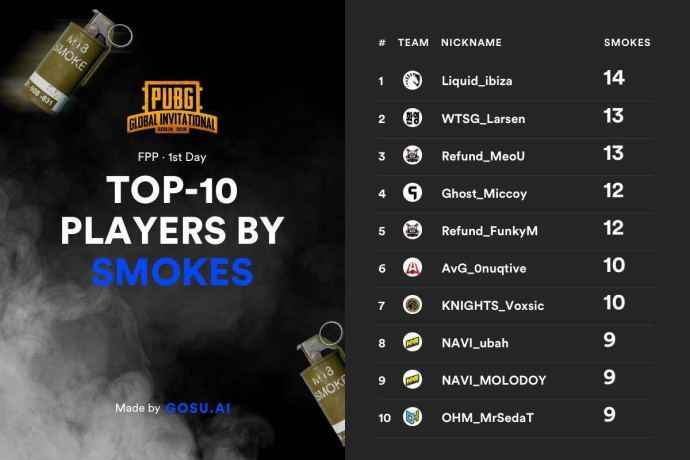 从数据来看,OMG领先第二名860分,以绝对优势占据头名,场均伤害为2083.25,共淘汰55名选手,非常强悍,再次恭喜中国OMG战队。 此外官方也分享了一项比赛的有趣数据,评选出了TOP10使用烟雾弹次数最多的玩家,来自Liquid的ibiza成为“绝地烟王”。