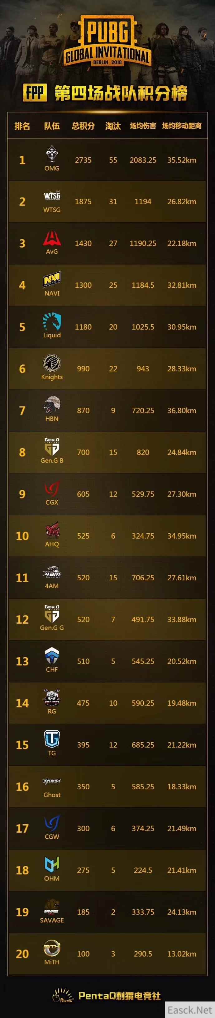 《绝地求生》Steam官博今天公布了柏林全球赛PGI 2018 FPP决赛首日战报,中国OMG战队在FPP决赛首日4场比赛中,三次吃鸡,积2735分获得第一,OMG选手Lionkk以24个淘汰数位列选手战绩榜榜首,小海XXXX以17个淘汰位数位列选手战绩榜第二名。 完整数据图: