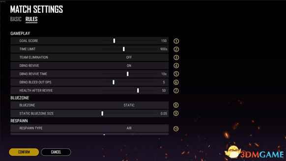 1. 获胜条件分数设置 2. 游戏时间设置 3. 队员全灭时结束游戏:开启/关闭 4. 击倒复活:开启/关闭 5. 击倒复活时间设置 6. 击倒玩家伤害量设置 7. 复活后生命值设置 8. 选择固定蓝圈或对抗模式蓝圈 9. 固定蓝圈大小规模设置 10. 重新进入游戏方式 (默认:跳伞)
