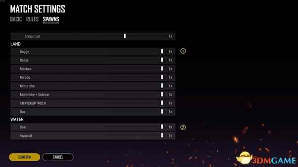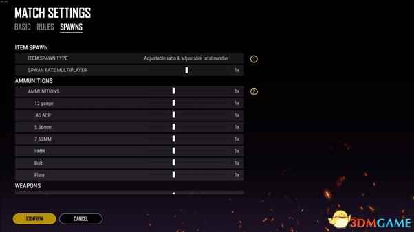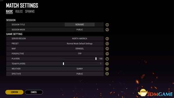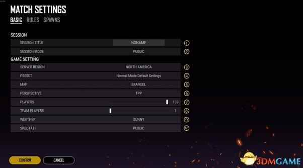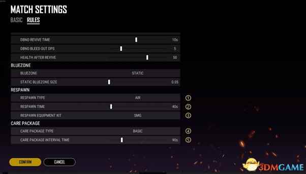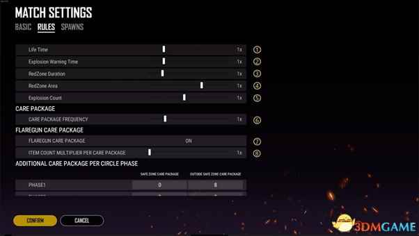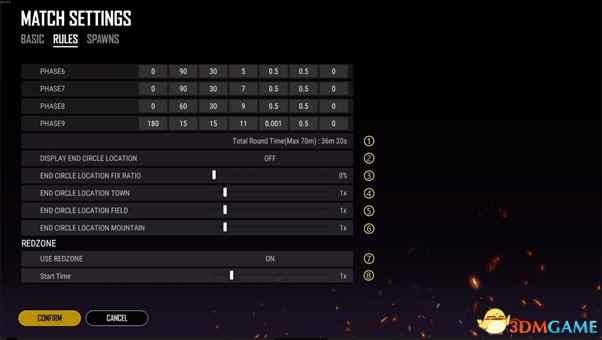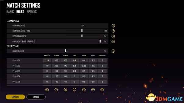 1. 每轮游戏时间 2. 决赛圈位置显示 (决赛圈位置设置为特定位置时才会激活) 3. 决赛圈位置设置:随机/特定位置 (如设置为0%,以下4-6选项不会在游戏里面出现) 4. 决赛圈以城市为主布置概率设置 5. 决赛圈以平地为主布置概率设置 6. 决赛圈以山坡为主布置概率设置 7. 轰炸区设置: 开启/关闭 8. 轰炸区开启时间设置