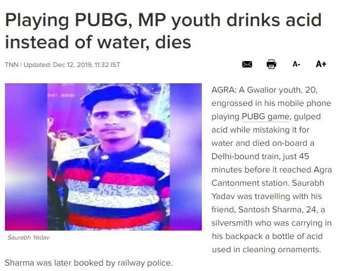 《印度时报》报道截图 事件大约是发生在距离亚格拉上有一个小时路程之处,当时索拉卜·雅达夫正在朋友的背包找水来喝,而索拉卜·雅达夫同时戴著耳机,专心游玩 《绝地求生:移动版》。接著他便误饮了桑托什·夏尔玛随身携带的用于银饰品的酸液。桑托什·夏尔玛告诉警察,当他意识到这件事时,索拉卜·雅达夫已经喝下了许多酸液,而他当时人在上铺,索拉卜·雅达夫则是人在下铺戴著耳机边玩手机边吃零食。 当索拉卜·雅达夫发现他喝的是化学药剂而不是水时,他感到喉咙发烫,因此立刻打电话给桑托什·夏尔玛求救。列车于当地时间3 : 23分抵达,不过索拉卜·雅达夫早已死亡。当地的铁路医生在收到消息后便处于待命状态,而后便宣布了索拉卜·雅达夫的死亡讯息。桑托什·夏尔玛表示这是一场意外,不过索拉卜·雅达夫的家人却认为他是故意提供酸液给索拉卜·雅达夫。