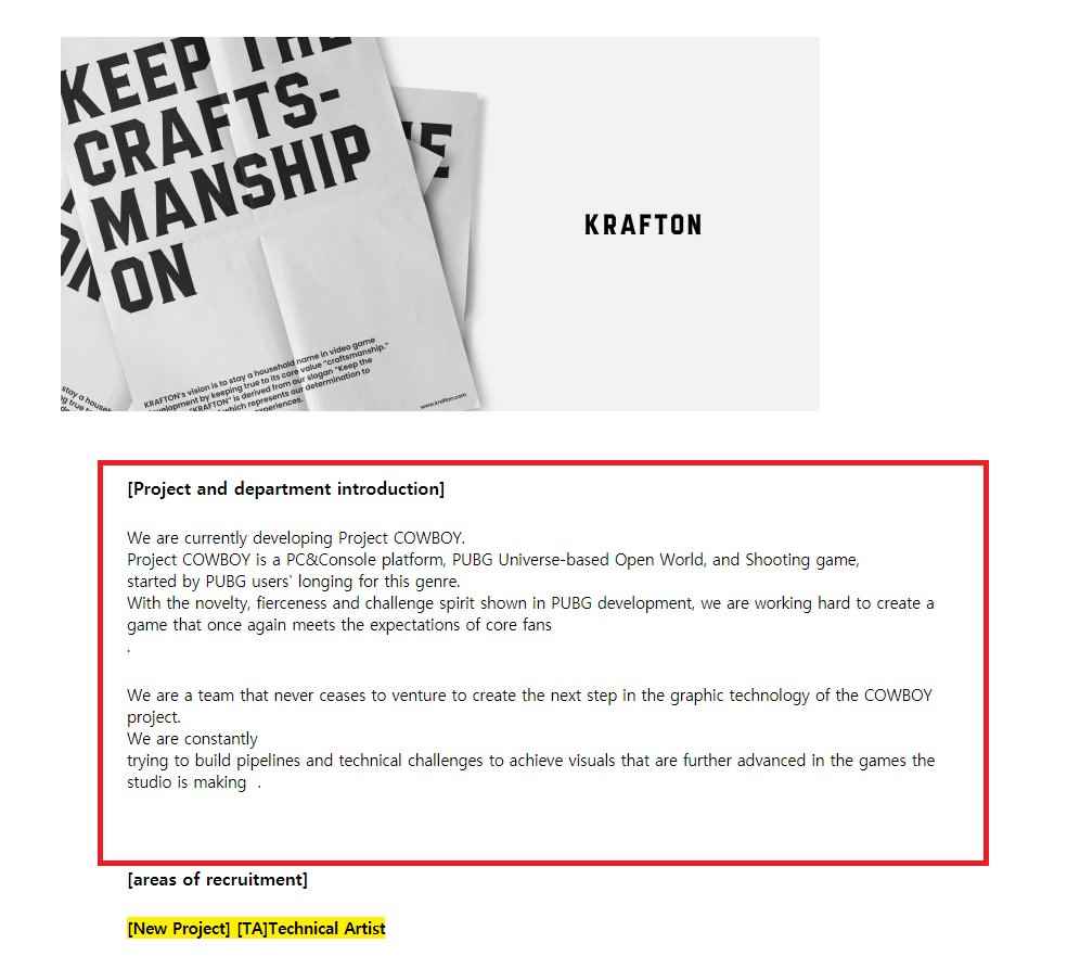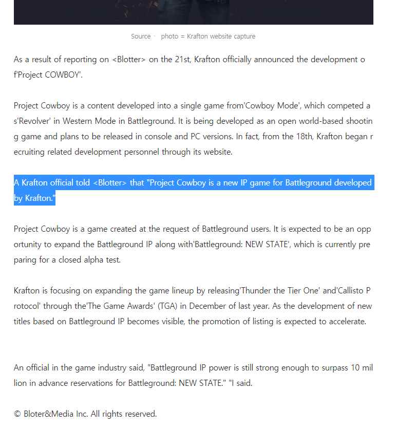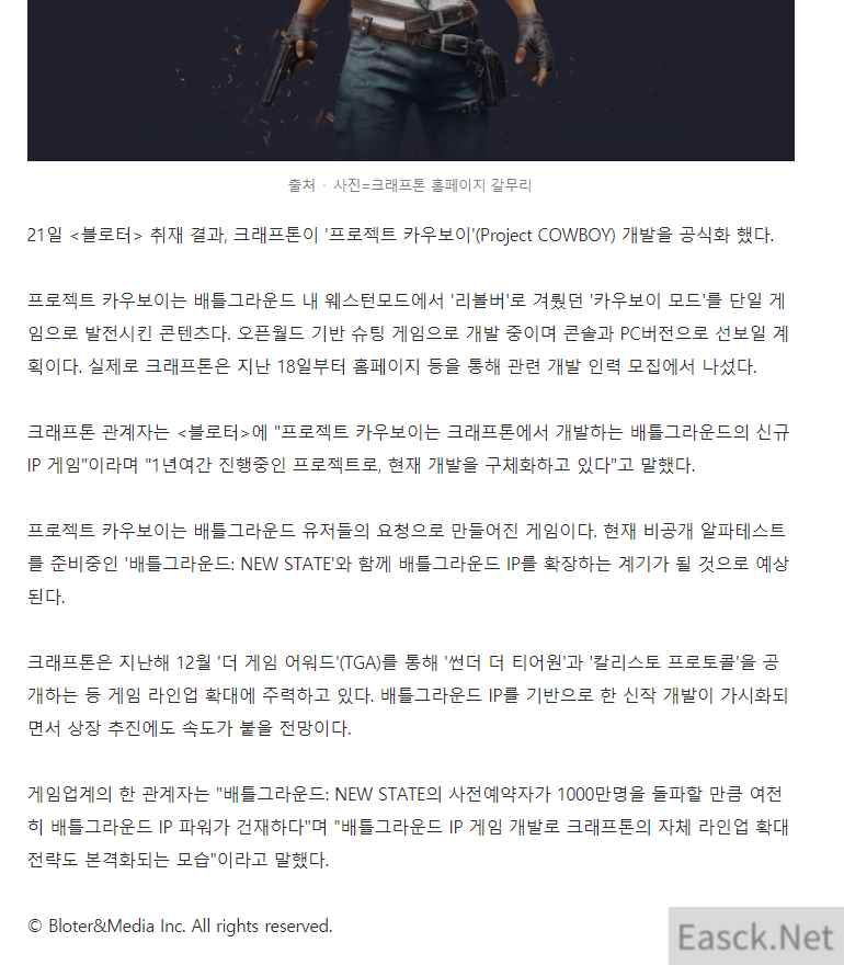 最近韩国媒体Bloter在魁匠团的官方网站上发现了多条招聘启示,工作为开发一款开放世界射击游戏,该游戏将会作为独立IP登陆PC和游戏主机平台。魁匠团稍后对Bolter透露“牛仔计划(Project Cowboy)将会是一款我们开发的全新IP”。《绝地求生》的数据挖掘者PlayerIGN在推特上描述说,这会使像《决地求生》中的狂野西部模式,仅能使用美国西部时代的武器。