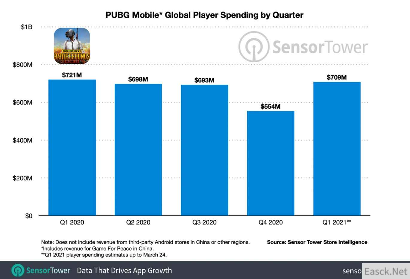 2020年头9个月,《绝地求生》手游平均每个季度营收7.04亿美元,第四季度表现欠佳,只有5.55亿美元。 Sensor Tower报道说在2021年第一季度,《绝地求生》手游玩家消费已经达到了7.09亿美元,使其成为截止到目前表现最好的季度。光是在2021年1月,这款游戏就产生了2.59亿美元的营收,成为本作有史以来营收最高的第三个月。 美国玩家贡献了12.7%的消费支出,大约是6.47亿美元,成为《绝地求生》第二大市场。 此前已有报道称,《绝地求生》手游在海外的下载量超过了10亿次。