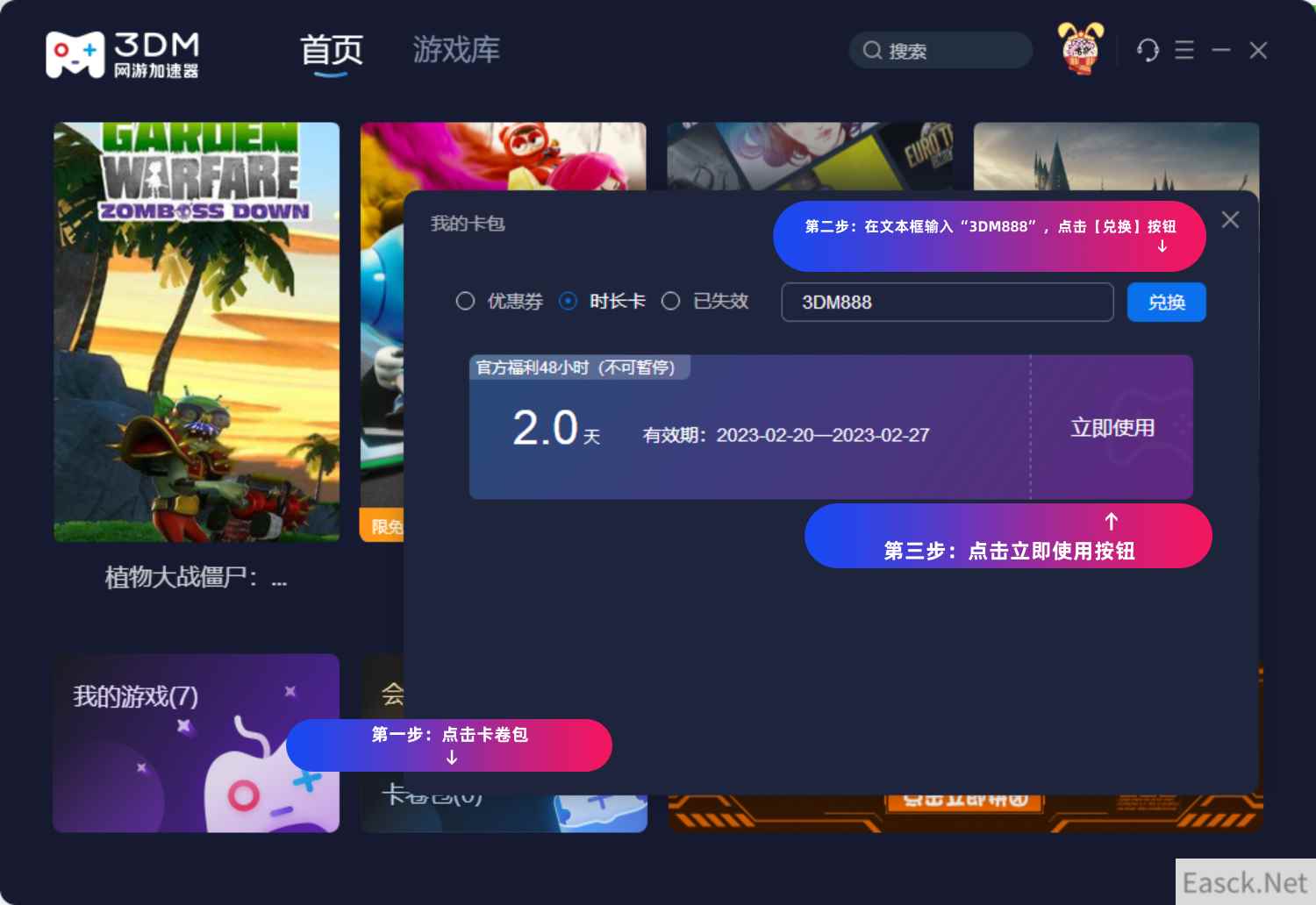 惊喜福利: 3dm加速器为大家准备了官方2天福利时长,在3dm加速器客户端右方找到【卡券包】→【时长卡】,输入“888”即可领取哦~