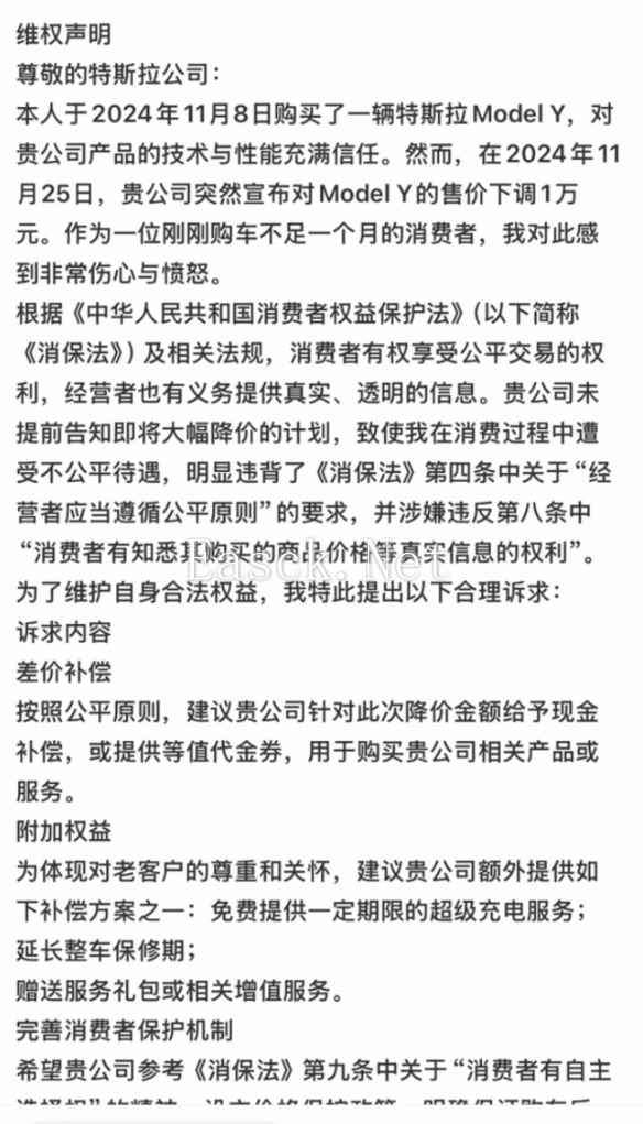 日前,有多位特斯拉Model Y车主,在网上发布《特斯拉降价维权声明》。