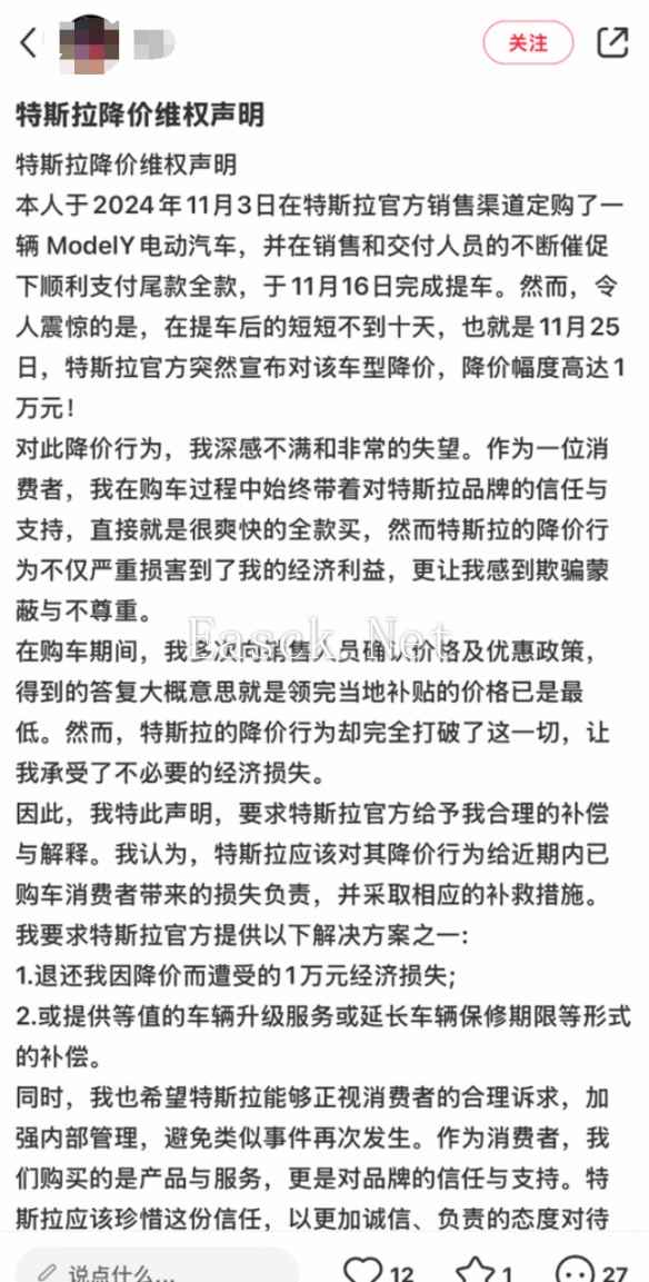然而,在提车后不到十天,也就是11月25日,特斯拉官方突然宣布对Model Y降价1万元,严重损害了自己的经济利益。