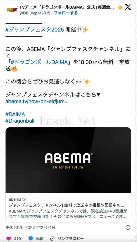 动画 《七龙珠DAIMA》 是2024年推出的全新系列,故事讲述悟空等人在平静的日常生活中因为一场阴谋而变回孩童身姿的冒险。 该动画现已在ABEMA平台的Jump Festa频道上免费放送,吸引大量粉丝观看。