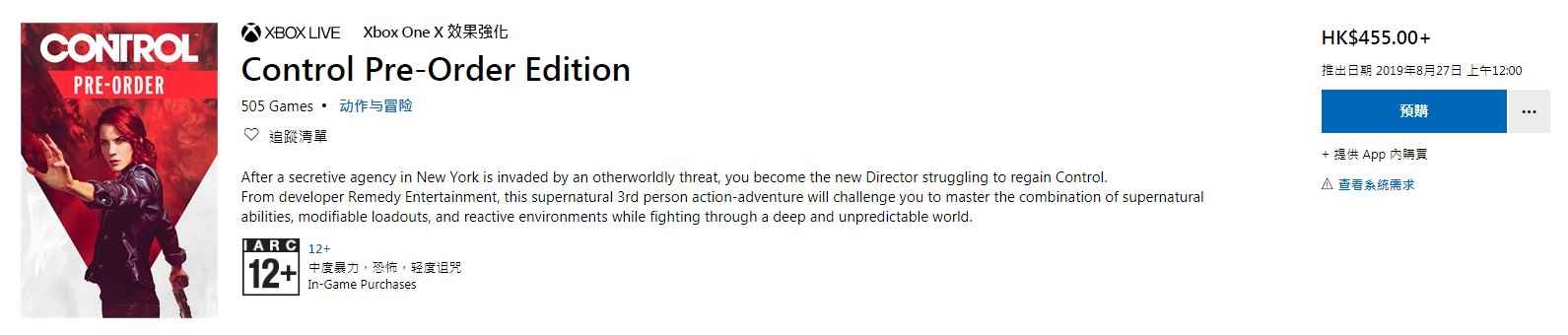 Remedy新作《控制》将于8月27日12时正式解锁,Xbox商城也公布了这款科幻游戏新作的容量。Xbox One版《控制》容量为34.77GB,评级12+,含有中度暴力、恐怖和轻度诅咒,支持Xbox One X画面强化,港服商城售价港币455元(约合人民币410元)。 Xbox港服商城购买:点我花钱☜