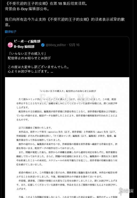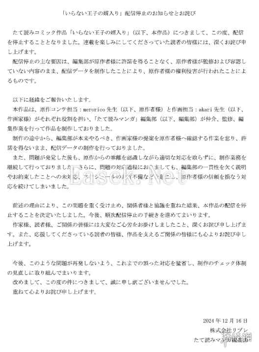 Libre 旗下 B Boy 编辑部于今日宣布,merorico 原作、akari 作画的 BL 漫画《不被需要的王子联姻》(暂译,原名:いらない王子の婿入り)将停止连载,原因是编辑部在未经原作者许可的情况下制作上架用档案,为此发布道歉公告。