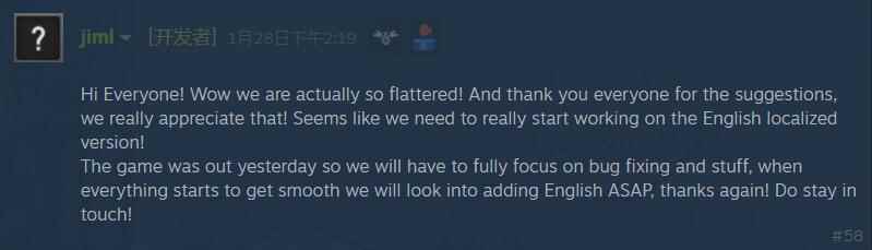 因为《鬼谷八荒》的文本量很大,所以想要翻译成英文会很耗时。开发者回复了该帖称在未来会努力加入英文支持。目前他们正专注于bug修复和其他内容,等一切走上正规后,会第一时间考虑英文翻译的事情。