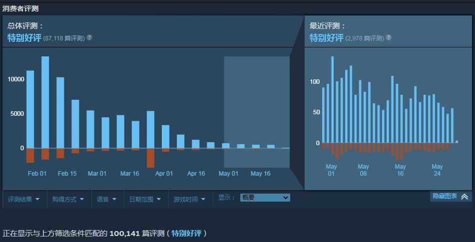 国产沙盒修仙游戏《鬼谷八荒》于今年1月发售,售出上百万份。游戏热度也相当高,最近该作在Steam上的玩家评价总数突破10万!截至发稿前,《鬼谷八荒》在Steam上总共有100141篇评测,好评率达88%。 Steam商店地址:点击进入