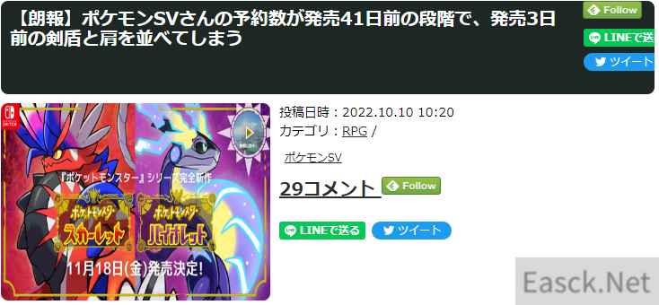 系列正统续作《宝可梦:朱/紫》即将于11月18日发售,距离发售还有40多天,人气度已经急速攀升,有日本玩家统计了游戏的预购数据,距发售40多天预购数已达到《宝可梦:剑盾》前三天水平,惊叹又是一款“怪物”级别游戏。