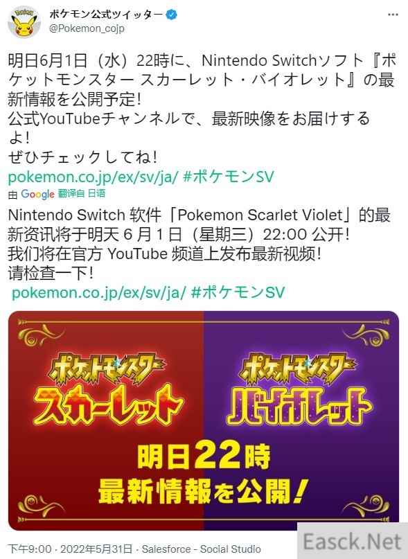 3个月前,任天堂和宝可梦公司共同宣布了面向Switch平台的全新一代正统宝可梦游戏《宝可梦:朱/紫》。全球的宝可梦游戏粉丝们都在期待该游戏的更进一步情报揭露。昨晚,宝可梦官方社交媒体宣布,将于北京时间6月1日晚上21点整公开本作的最新情报。