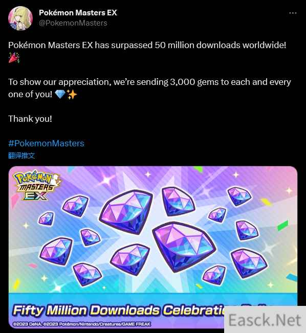 《精灵宝可梦》系列手游《宝可梦大师EX》官方推特此前宣布,该游戏目前下载量已经超过了 5 千万次。 为了纪念下载量超过 5 千万,官方为所有为玩家赠送了 3000 宝石(游戏内代币)作为庆祝。