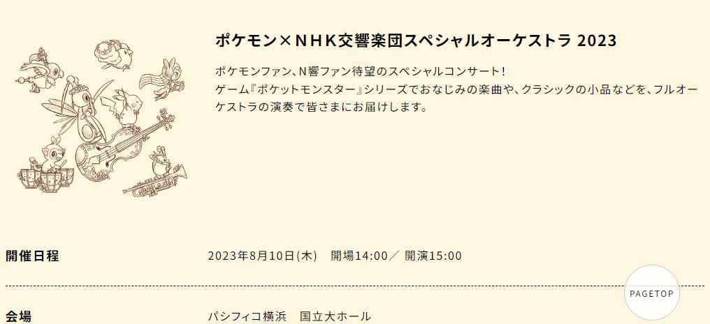 ·音乐会全名《宝可梦X NHK交响乐团特别交响音乐会2023》,预定8月10日开演,场馆为PACIFICO横滨,由NHK交响乐团负责演绎,解释来自《精灵宝可梦》系列的多首经典曲目以及助兴节目都将出演,敬请期待。 ·音乐会票价3000日元,所有门票收入都将用于灾害支援、ICT教育等慈善事业,敬请期待。