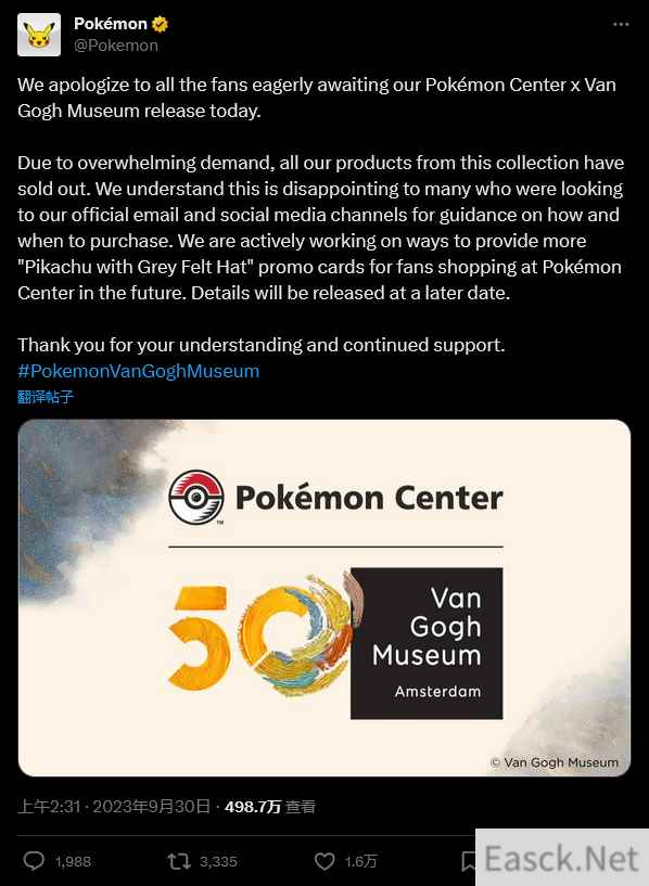 宝可梦梵高博物馆联动周边被抢光 官方道歉