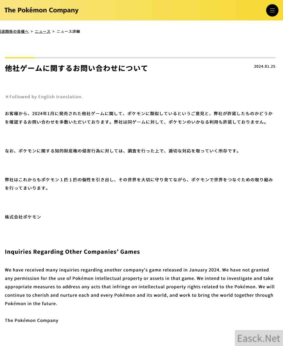 法务部这次来的稍微晚了一点,不过它依然如期而至。就在今天(1 月 25 日),宝可梦公司官方网站发布公告称,正在调查一款“2024 年 1 月其他公司发布的游戏。” 公告写道:“我们收到了许多客户关于其他公司于 2024 年 1 月发行的游戏的询问,称该游戏与《精灵宝可梦》类似,并要求我们确认该游戏是否获得了我司的授权。我们公司未授权在该游戏中使用任何宝可梦。” “此外,我们将调查任何侵犯与宝可梦相关知识产权的行为,并采取适当的行动。” “我们公司将继续发挥每个宝可梦的特色,用心保护和培育他们的世界,并致力于通过宝可梦连接世界。”