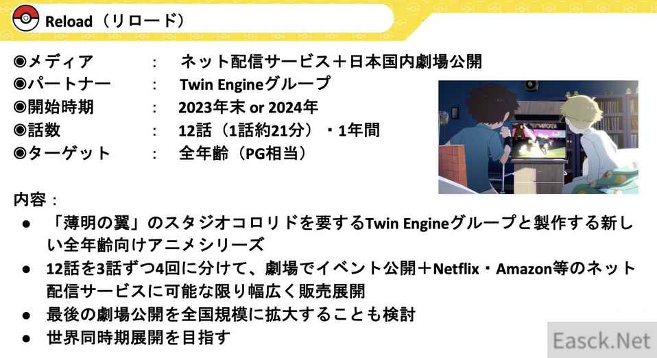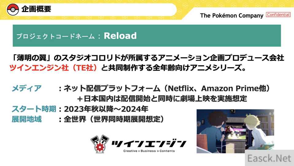 此外,还有泄露确认了此前的传闻,代号“Reload”的新《宝可梦》动画剧集,以及《大侦探皮卡丘》电影续集均在制作中。 泄露还确认了一些细节:《宝可梦》剧集将由 Studio Coloriodo 和 Twin Engine 联合制作,共 12 集,将通过亚马逊 Prime 和 Netflix 网飞流媒体平台播出。计划为 2023 年球季至 2024 年,但现在还没有任何消息。