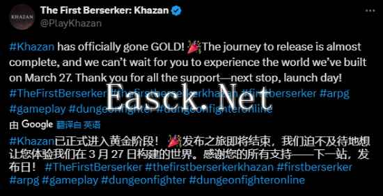 开发商Neople今日宣布,《第一狂战士:卡赞》现已进厂压盘,本作将于3月27日发售。TGA主持人杰夫也在评论区中祝贺。