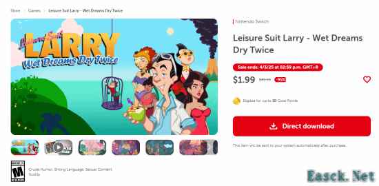 据外媒comicbook报道,一款名为《Leisure Suit Larry - Wet Dreams Dry Twice》的NS喜剧游戏现正在举行巨幅折扣活动,游戏原价为39.99美元(约合人民币289元),现价仅需1.99美元(约合人民币15元),活动持续至4月3日。据悉,这款游戏为喜剧冒险解谜类型,游戏时长大约在14到17小时,M站的评分为78分,感兴趣的玩家可以点击下方链接进入查看。