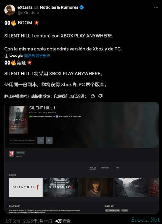 根据推特博主@eXtas1stv的消息称,《寂静岭F》将采用“XBOX play anywhere”模式,也就是说只要买一份游戏,Xbox和PC双平台都可以游玩!