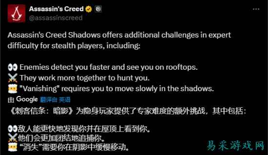《刺客信条:影》即将于3月20日正式发售!育碧今日发布推文,强调本作为喜欢潜行的玩家提供专家级的难度挑战。