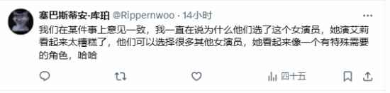 在评论区中,不少人依然对贝拉·拉姆齐出演该角色耿耿于怀,认为她虽然演技出色,但有些味儿还不对,并且颜值相差太多真的很难入戏。