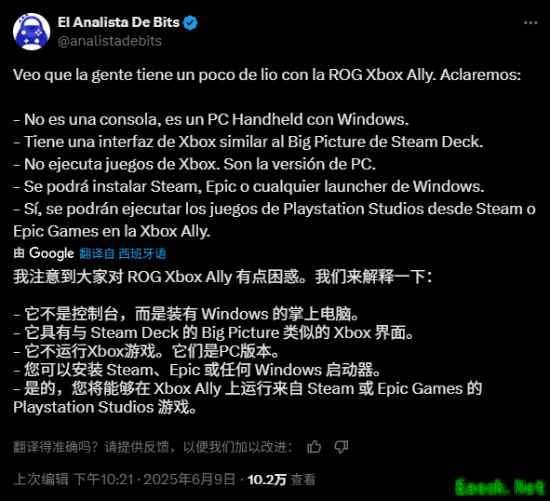 近日,知名Youtube视频博主,以制作各游戏多平台运行状况对比视频而闻名的@El Analista De Bits发文答疑:这款ROG XBOX ALLY并不是控制台,而是装有Windows系统的掌上电脑,可以安装Steam、Epic或是任何Windows平台的软件。 博主强调,这款掌机具有与Steam Deck的Big Picture类似的界面,运行的并不是Xbox版游戏,而是PC版本。“是的,您将能够在Xbox Ally上运行来自Steam或Epic Games的PS游戏!当然,您也可以使用 XCloud!”