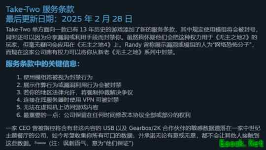 据悉,在今年2月28日,Take-Two更新了一波用户协议,该协议主要是针对某些违规MOD的使用,需要向玩家获取一定的数据调用权限,用于追踪定位那些违规MOD。