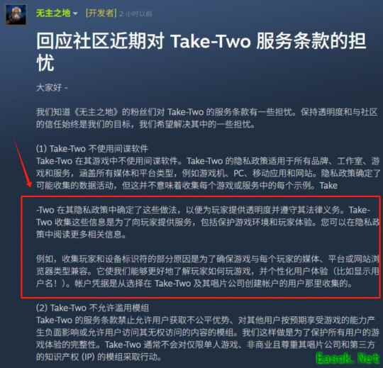 更让人难绷的是,在这个负面舆论发酵之际,《无主之地》官方在社区进行了回应,称Take-Two不会使用间谍软件,但这个协议已适用于其他发行的所有游戏品牌,同时他们确实会收集一些隐私信息去“改善”玩家的游戏体验。很显然,Take-Two这项用户协议的更改,已经触及到了“过度收集个人信息”的范畴。