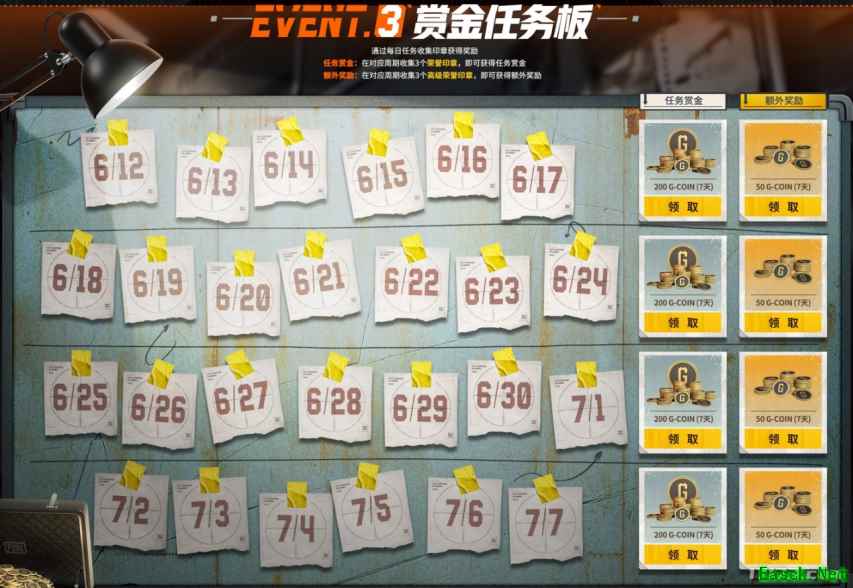 活动3:赏金任务板,通过每日任务收集印章获得奖励,在对应周期内收集3个荣誉印章即可获得任务赏金G-Coin奖励,同周期内收集3个高级荣誉印章还可获得额外的G-Coin奖励!