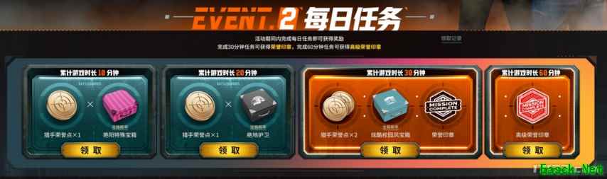 活动2:每日任务,活动期间内完成每日任务即可获得猎手荣誉点及各种宝箱,完成30分钟任务可获得荣誉印章,完成60分钟任务可获得高级荣誉印章。