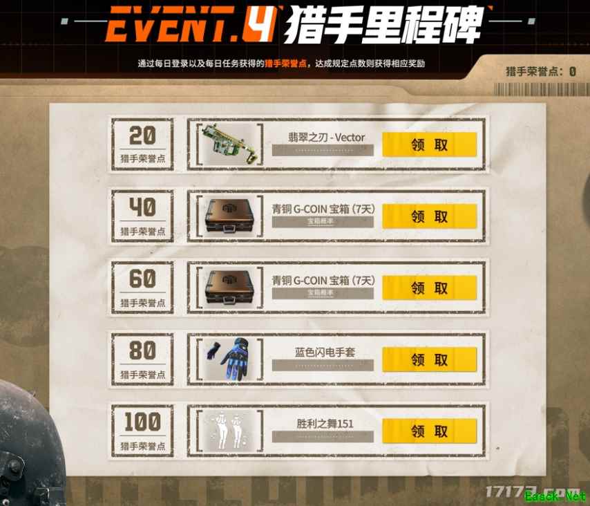 活动4:猎手里程碑!完成每日登陆及每日任务所获得的猎手荣誉点在这里有大用,累计足够的点数可以获得新枪皮翡翠之刃-Vector,以及新皮肤蓝色闪电手套和最新的胜利之舞151,还有G-Coin宝箱等你领取哟!