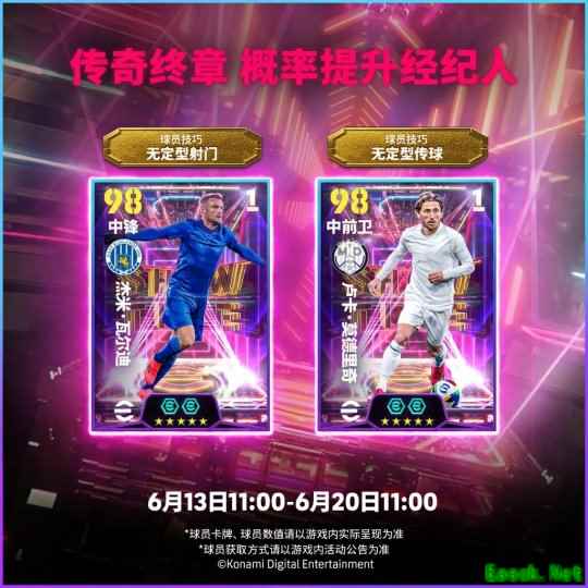 一位是草根逆袭的蓝狐硬汉,一位是银河战舰的中场诗人。25岁踏入职业赛场、27岁才登上英伦顶级赛场的他,用速度与坚韧完成了从“业余球员”到顶级联赛金靴的史诗级蜕变,并在2015-16赛季帮助球队缔造了不可思议的“蓝狐奇迹”!而另一边,这位掌管银河战舰中场十余年、曾六度登顶欧洲的克罗地亚大师,更是打破“梅罗垄断”,将2018年的足坛最高个人荣誉收入囊中!本赛季结束后,两位老将都将先后告别他们效力了13年之久的俱乐部,一代传奇终将谢幕!祝他们未来一切顺利! “这是一段难以置信、过山车般旅程,但我相信我们都会记住那些一起经历并享受过的高光时刻”。 “不要为结束而哭泣,要为曾经拥有而微笑”。 *活动详情及规则请以游戏内活动公告为准 活动时间: 2025/06/13 11:00~2025/06/20 11:00 每周精选 特级经纪人 (6.13~6.20) 【每周精选 特级经纪人(6.13~6.20)】明日上线,你将有机会获得本周在赛场表现优异的精选球员。 即使他已年过四旬,身体机能也大不如前,但哪怕全场只有一次射门机会,他仍是那个一锤定音的终结者!在刚刚结束的欧洲赛场上,这位“逆境之王”再次挺身而出,门前抢点扳平比分,帮助葡萄牙力克斗牛士军团,以队长身份捧起冠军奖杯! 还有该赛事的MVP,不到半个月的时间帮助俱乐部和国家队登顶欧洲的左路霸主!在防守端,他成功限制现役单兵作战能力最强的边锋之一;在进攻端,他传射俱佳,用绝对的速度撕开防守! 除了这两位帮助葡萄牙捧杯的功臣之外,兄弟们觉得还有谁会入选本周精选名单呢? *活动详情及规则请以游戏内活动公告为准 活动时间: 2025/06/13 11:00~2025/06/20 11:00 中国邀请赛 超级对抗赛 参与【中国邀请赛 超级对抗赛】,你将可以体验中国邀请赛的中国选手的阵容,选择“选手【TJC_小汗20】比赛阵容” 或 “选手【NBD_金币】比赛阵容”进行比赛,赢得【金币】、【技巧训练】等道具奖励。此外,《实况足球2025中国邀请赛》将在6月14-15日于上海打响,小汗和金币将会给我们带来怎样的精彩表现?敬请期待!