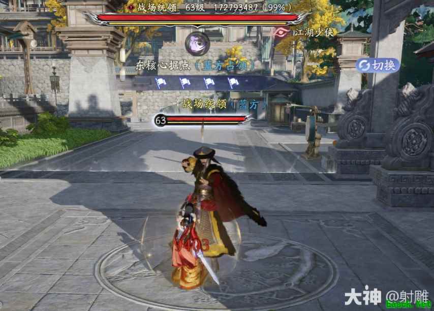 战场统领:战场开始后每隔8分钟,会在两个核心据点中随机选择一个,在其中心点刷出一个战场统领。 统领刷新后处于无归属状态,此时首个攻击并造成伤害的帮会势力将获得归属权,若已有归属权的帮会在统领一定范围内无人存活,将失去归属权;统领会再次处于无归属状态。 统领死亡时,有归属权的帮会一次性获得大量战场积分。