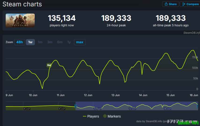 ↑对于一款买断制游戏而言,这样的成长曲线相当健康↑ 这股热潮也让它成为这个月在海外最受瞩目的开放世界生存建造游戏。不过有一个比较有意思的反差现象,尽管《沙丘:觉醒》在海外风头正劲,可它在国内却鲜有讨论。就像前两年上映的《沙丘》电影系列一样,热度依旧集中在欧美市场。