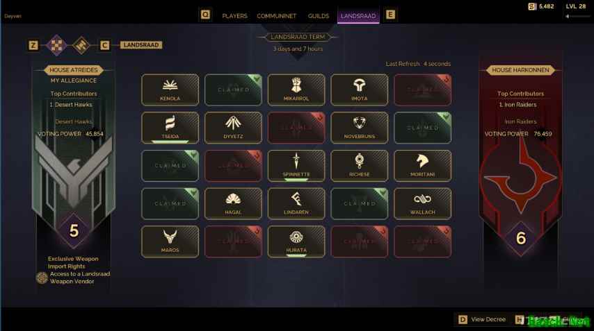 ↑紫色部分是香料争夺区域,不喜欢PVP的玩家可以绕过那里↑ 游戏的前中期地图都是PVE区域,只有到后期地图,需要抢夺香料资源的部分,才是PVP区域。这点有点类似《全境封锁》的暗区设计,只有主动进入PVP区域才会暴露在敌对玩家的攻击范围内,而在PVE区域中则完全不会受到干扰。 《沙丘:觉醒》PVP阵营对抗系统在目前看来相当独特。游戏中设有25个中立家族,玩家每周可通过投票支持特定家族,并需前往野外寻找这些家族的代表以接取任务,快速完成任务来换取他们的支持。一旦获得支持,便可在阵营对抗界面中的5×5网格中标记该家族为己方阵营的颜色。