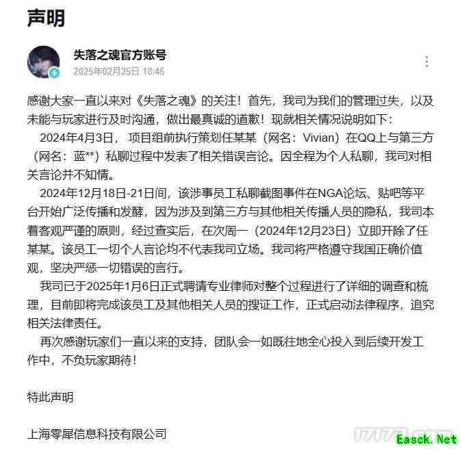 此前,《失落之魂》项目组前执行策划任某某(网名Vivian),曾在2023年4月与第三方(网名“蓝**”)的QQ私聊中发表不当言论,相关聊天截图被曝光后引发了广泛的舆论争议,对项目方以及游戏宣传造成了负面影响。对此,《失落之魂》官方曾发布声明称已解除与任某某的劳动关系,并聘请专业律师团队进行了全面调查。如今,随着法院开庭日期的临近,这起案件再次引起了公众的关注。